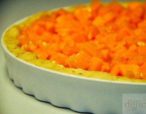 La foc mic, se topesc 2 linguri de unt cu 3 linguri de zahar pudra, pana se dizolva zaharul. Se adauga dovleacul, se amesteca, aprox 10 minute. Se raceste dovleacul la temperatura camerei. Se bate restul de unt pana devine crema, se adauga zaharul si se amesteca bine. Se adauga ouale, unul cate unul, apoi migdalele. Se amesteca bine de fiecare data. In momentul in care cuptorul este incins, crema pregatita, dovleacul racit, se scoate blatul din frigider, se pune crema de migdale, se pune deasupra dovleacul, apoi se introduce in cuptorul incins, aprox 30 – 35 minute.
