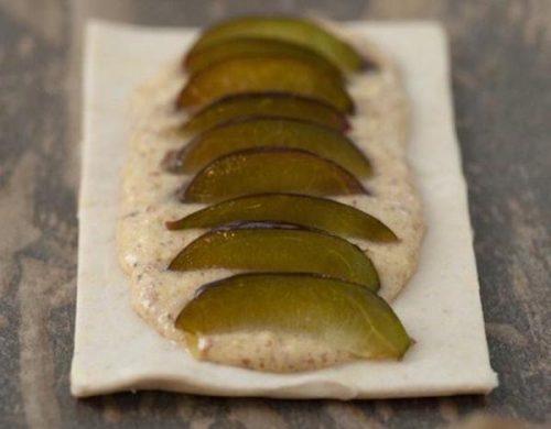 Dezghetam aluatul foietaj si il taiem in 6 bucati egale, apoi le transferam pe o tava tapetata cu putin unt si hartie pentru copt. Pregatim crema frangipane: amestecam bine zaharul si untul pana obtinem o crema pufoasa. Adaugam oul si esenta de vanilie, ametecand bine, apoi incorporam migdalele macinate si faina. Impartim crema frangipane pe aluat, avand grija sa nu atingem/acoperim marginile. Lasam un spatiu de minim 5 mm liber. Pastram aluatul la rece pana pregatim prunele.