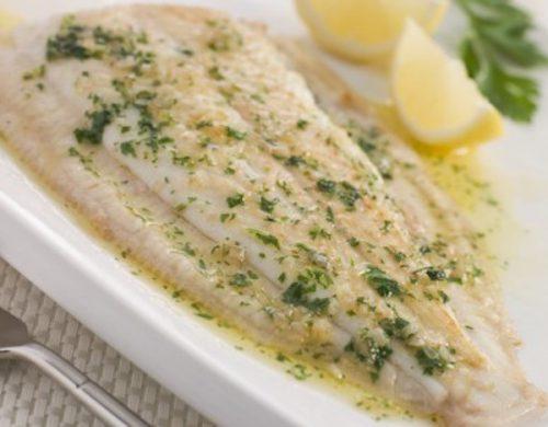 - Dupa ce s-a pregatit si cel de-al doilea peste, se sterge iar tigaia cu hartie de bucatarie, apoi se pregateste sosul: se pun 4 linguri de unt pe foc mediu, se topesc putin, se adauga sucul de lamaie si se amesteca bine. Se toarna peste fileuri, se presara cu patrunjel si sare mare. Se orneaza cu felii de lamaie.