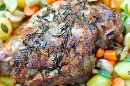 Intre timp, ametecam cartofii, morcovii, ceapa si usturoiul, presaram cu maioran verde, ulei de masline, sare si piper. Punem in tava jumatate pahar de apa. Acoperim vasul cu un capac sau folie de staniol. Punem la cuptor, in acelasi timp cu mielul, sub tava in care se afla mielul. Dupa 30 minute luam capacul/folia si lasam legumele in cotinuare in cuptor, intre 20 – 30 minute. Amestecam din cand in cand. Acoperim cu o folie de aluminiu daca devin maronii prea repede.